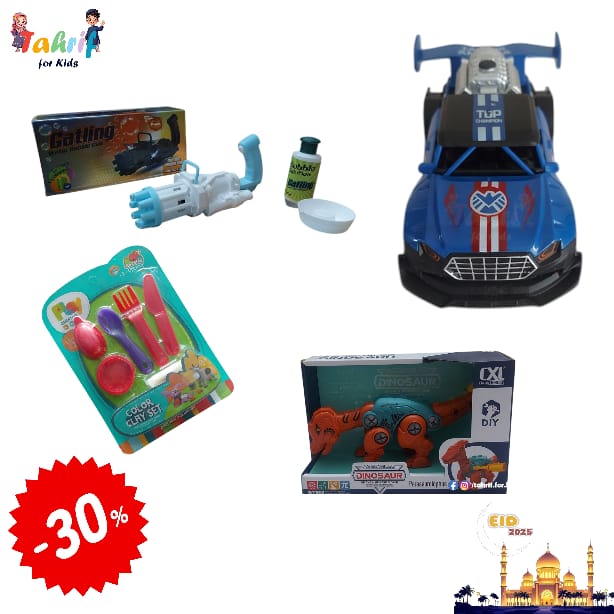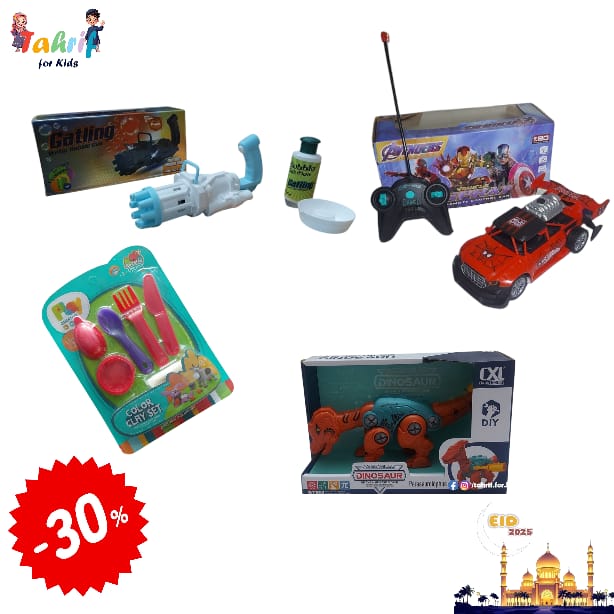 Combo 2 includes 4 Products - Assembled Dinosaur (Xuanhanosaurus), Avengers Vehicle Spray R/C Car, Bubble Gun Toy, and Color Clay Cutlery Set.